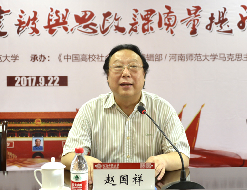 赵国祥致欢迎辞。他简要介绍了我校的历史、现状和取得的成就,强调了我校在思想政治工作和在思想政治理论课教学改革方面的有益探索。他指出,我校马克思主义学院发展势头良好,目前拥有一个年富力强、朝气蓬勃的领导班子,拥有一批政治强、业务精、素质高的教师队伍,正致力于进一步夯实马克思主义理论学科基础,加强马克思主义理论人才梯队建设,创新思想政治理论课教学方法等各项事业中,以只争朝夕的姿态投入到重点马克思主义学院的建设中。他邀请莅会的各位领导、专家多提宝贵意见,帮助河南师范大学马克思主义理论学科建设和思政课质量提升不断取得进步。