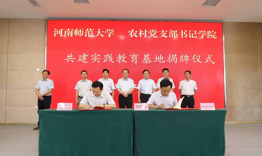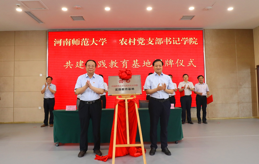 6月29日,“河南师范大学马克思主义学院——农村党支部书记学院实践教育基地”揭牌仪式在农村党支部书记学院举行。我校党委书记赵国祥,濮阳市人民政府副市长、濮阳县委书记、学院院长张宏义共同为实践教育基地揭牌,院长马福运与农村干部学院副院长胡长征代表双方签订了合作协议书。农村党支部书记学院常务副院长陈治、我校党委副书记陈广文、党委组织部部长张向战、党委办公室主任秦法跃、学院党总支书记蒋占峰及我院教师代表等50余人参加了揭牌仪式。仪式由农村党支部书记学院党委书记、常务副院长李国艳主持。
