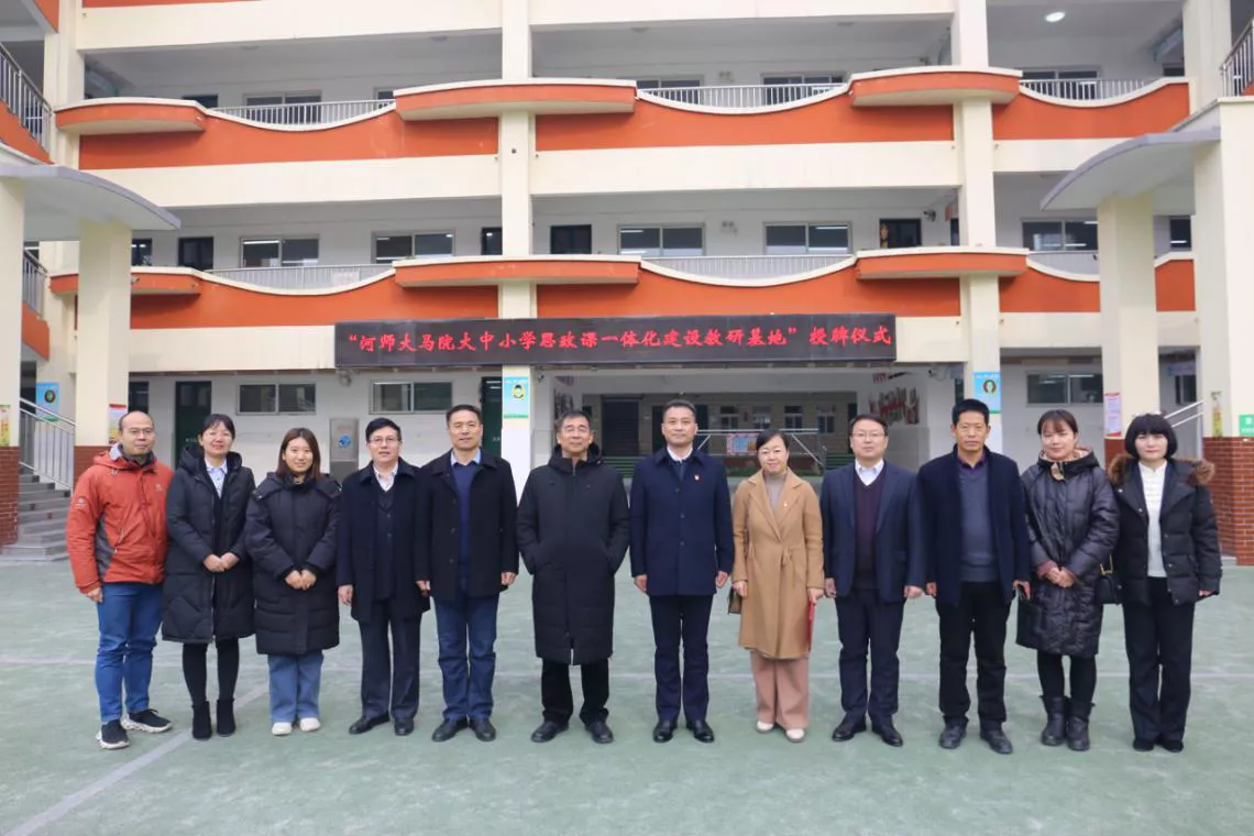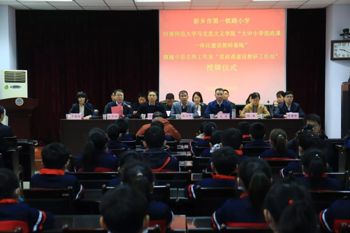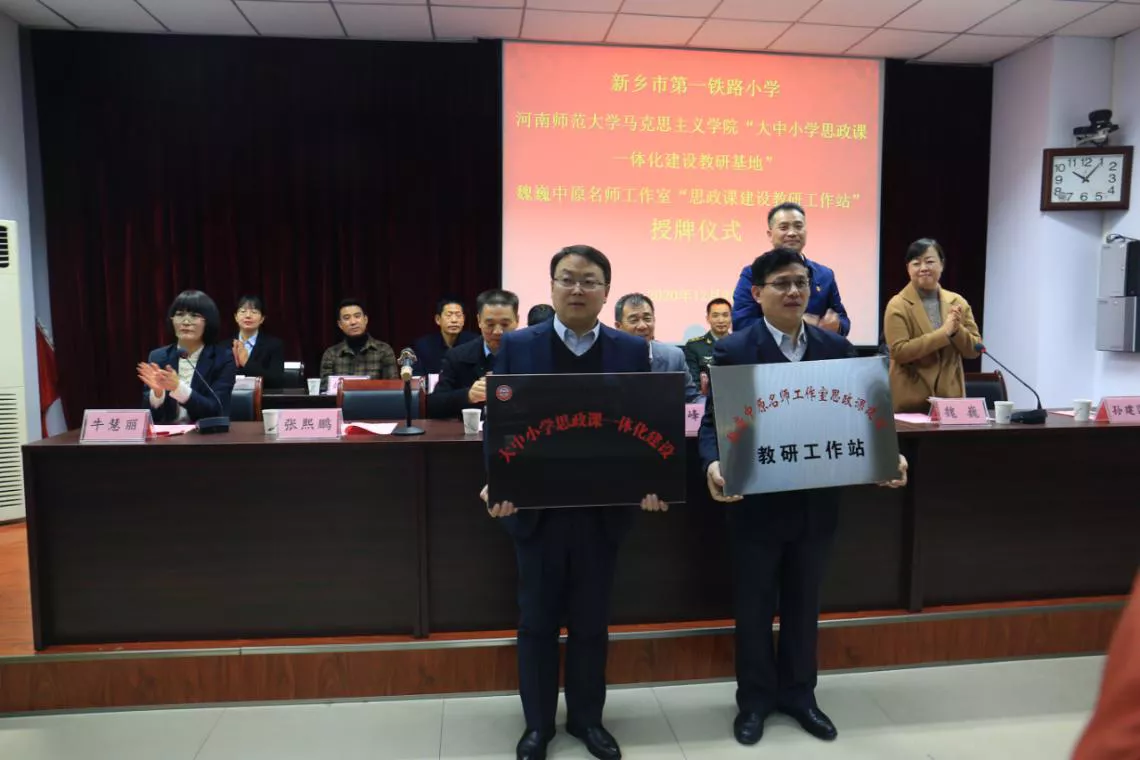 随后,我院院长蒋占峰、冯建局长和魏巍老师分别为新乡市第一铁路小学授牌。相信我院“大中小学思政课一体化建设教研基地”的成立,必将充分发挥我院马克思主理论学科和省重点马院的示范与引领作用,促进中小学思政课教师的专业成长,将上好思政课落到实处。