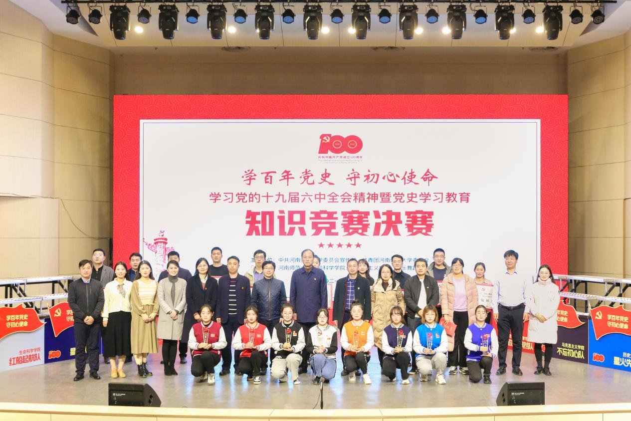 为庆祝中国共产党成立100周年,深入学习贯彻党的十九届六中全会精神,回顾党的光辉历程,引导广大青年学生一起学党史、知党情、跟党走,12月10日晚,学习党的十九届六中全会精神暨党史学习教育知识竞赛决赛在帕瓦罗蒂音乐厅举办。本次活动由河南师范大学党委宣传部、河南师范大学团委主办,河南师范大学生命科学学院、马克思主义学院、音乐舞蹈学院承办,校领导、各学院党委副书记、团委书记、复赛晋级决赛的八支代表队、帮帮团成员及学生代表参加此次活动。