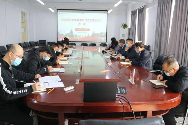 2022年10月18日下午3:00,河南师范大学教务处全体党员同志在文渊楼234会议室进行了党员理论学习大会,会议采取线上线下同步进行,梁存良主持会议。