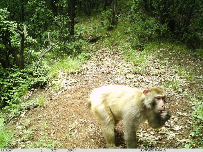 猕猴(学名:Macaca mulatta):体长51-63厘米。是典型的猕猴属动物,主要特征是尾短,具颊囊。躯体粗壮,平均体长约50厘米,它们的前肢与后肢大约同样长,拇指能与其它四指相对,抓握东西灵活,前额低,有一突起的棱。头部呈棕色,背部棕灰或棕黄色,下部橙黄或橙红色,腹面淡灰黄色。