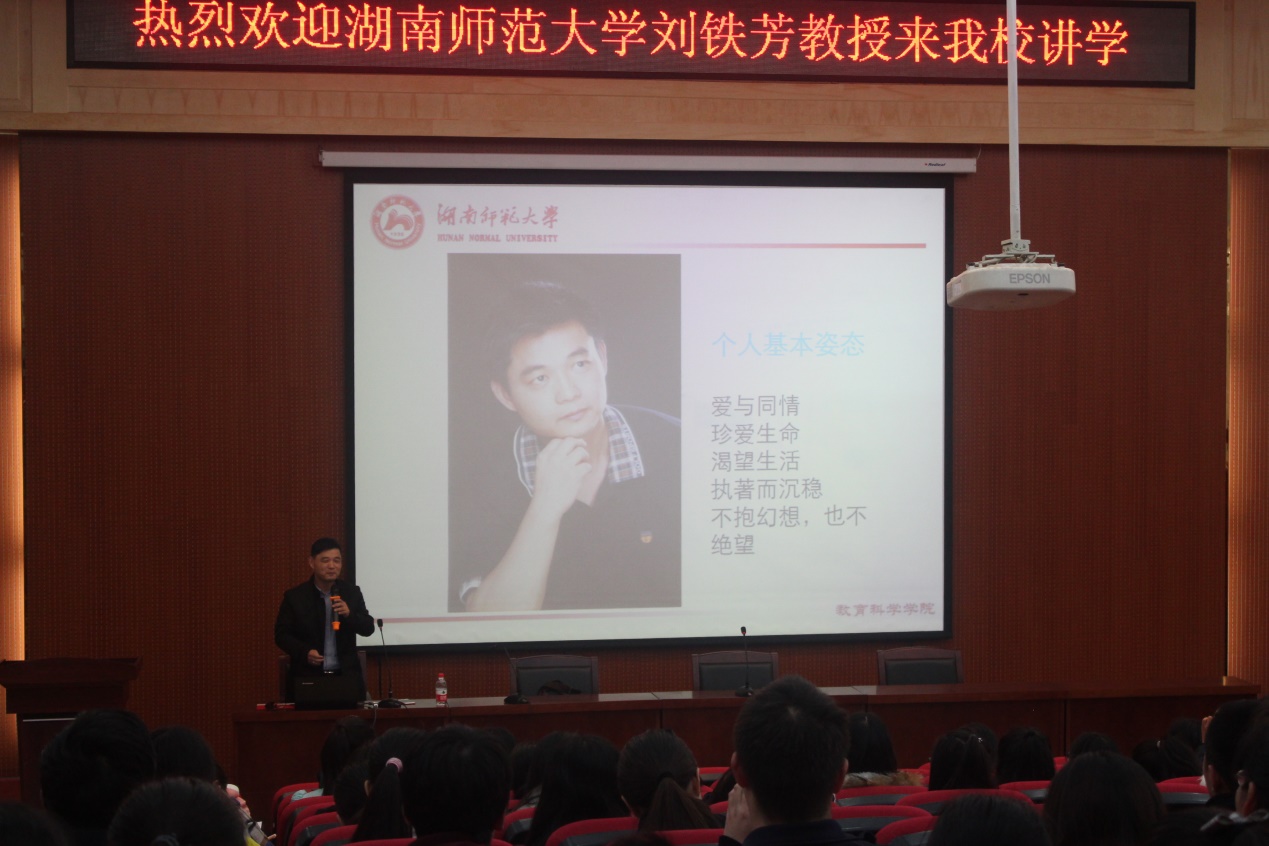 11月11日下午,湖南师范大学教育科学学院副院长,博士生导师刘铁芳教授应邀在我校东区B楼302报告厅,做了一场题为《个体发展历程与教育的内在秩序》的学术报告。教育学院相关领导、部分教师、研究生和本科生代表共200余人聆听了刘教授的精彩报告。报告由教育学院副院长李醒东主持。