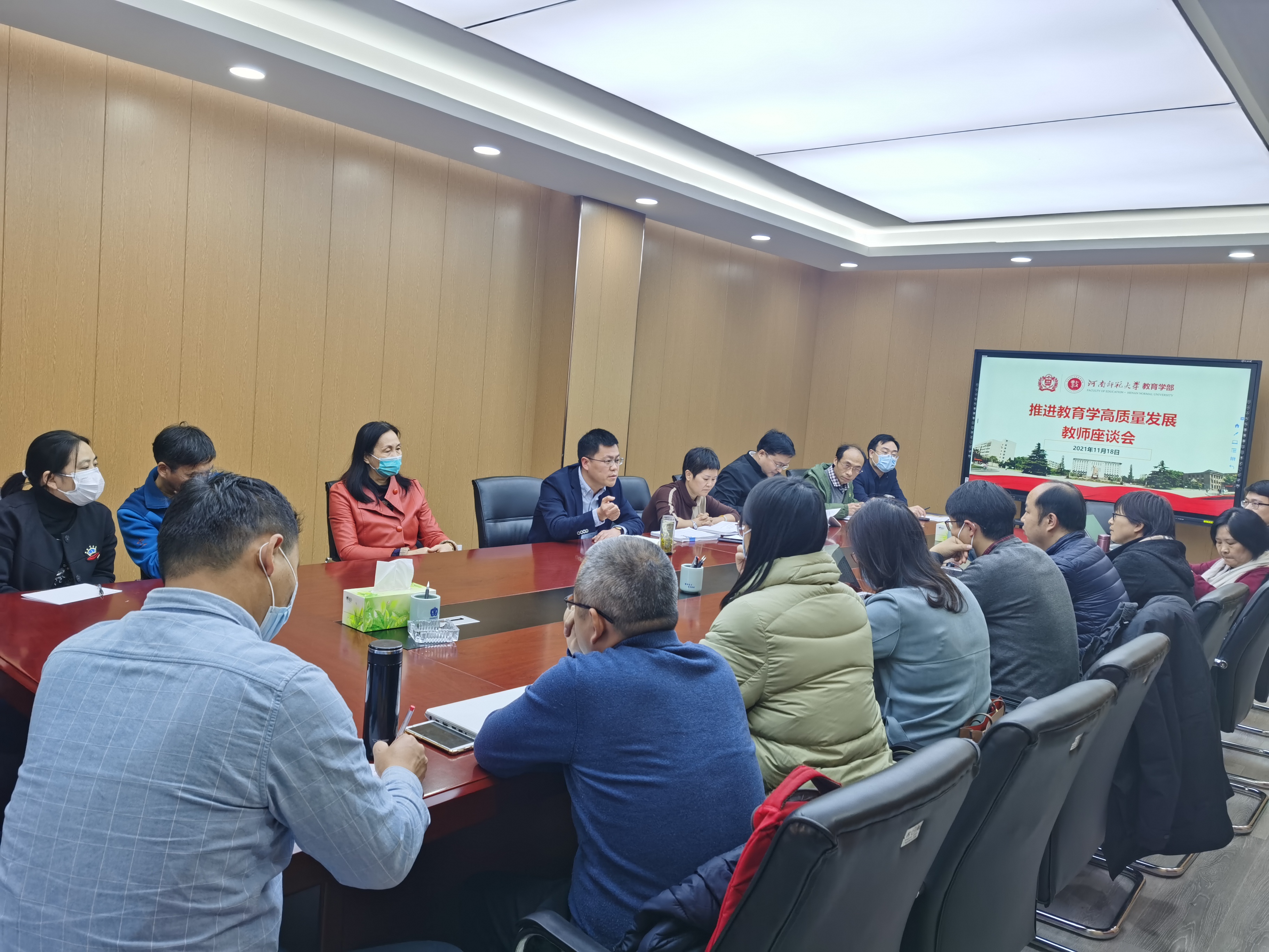 11月18日下午,教育学部“推进教育学高质量发展”教师座谈会在田家炳教育书院801会议室召开,学部班子成员、教育学院教师代表共20余人参加座谈会,会议由学部党委书记陈勇主持。