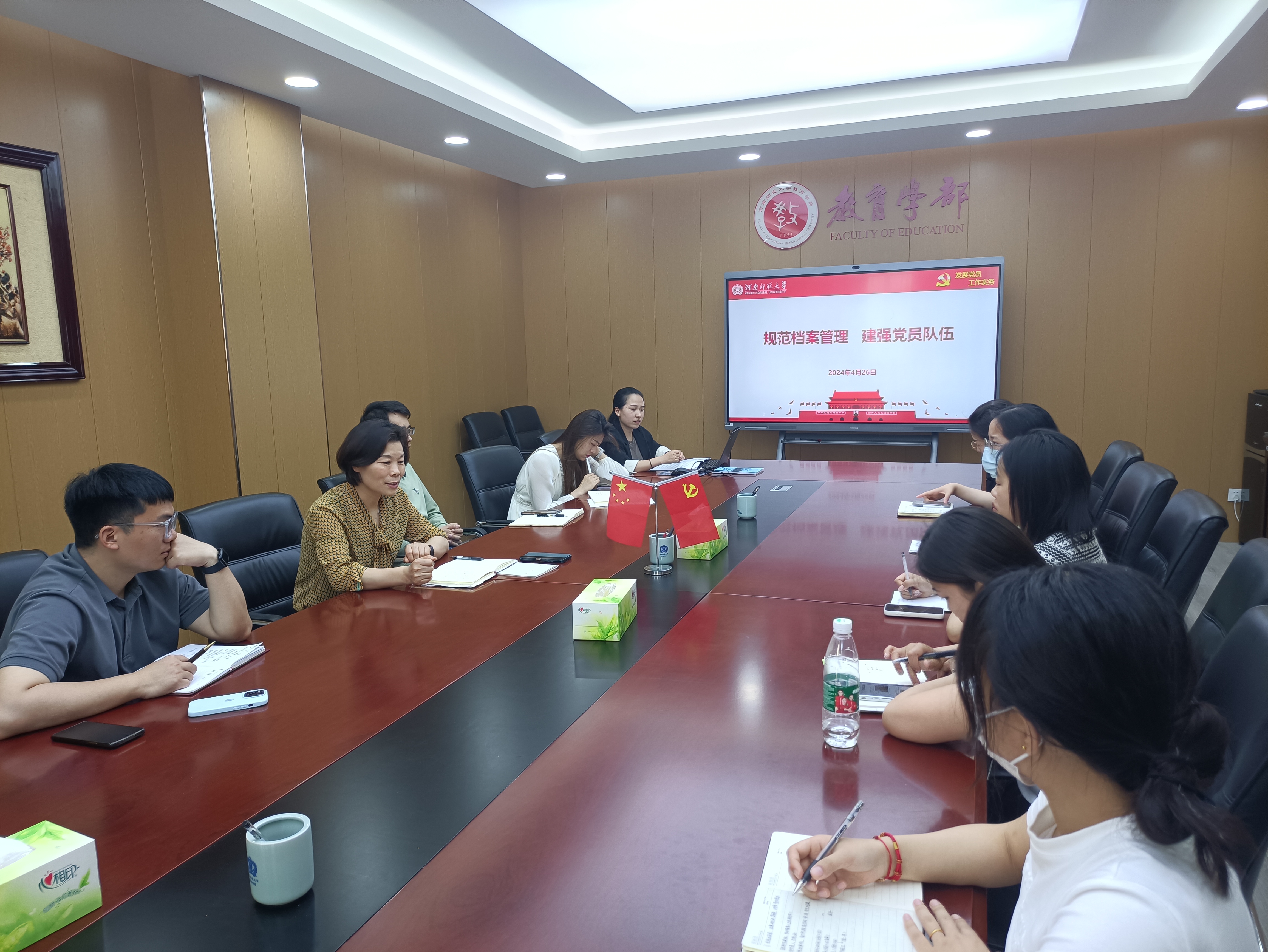 辅导员徐亚萍领学《中国共产党普通高等学校基层组织工作条例》和《中国共产党支部工作条例(试行)》,并以“规范档案管理,建强党员队伍”为题,对发展党员的阶段及时间逻辑、入党材料的规范填写、党员档案规范整理等多个方面进行了详细解读。