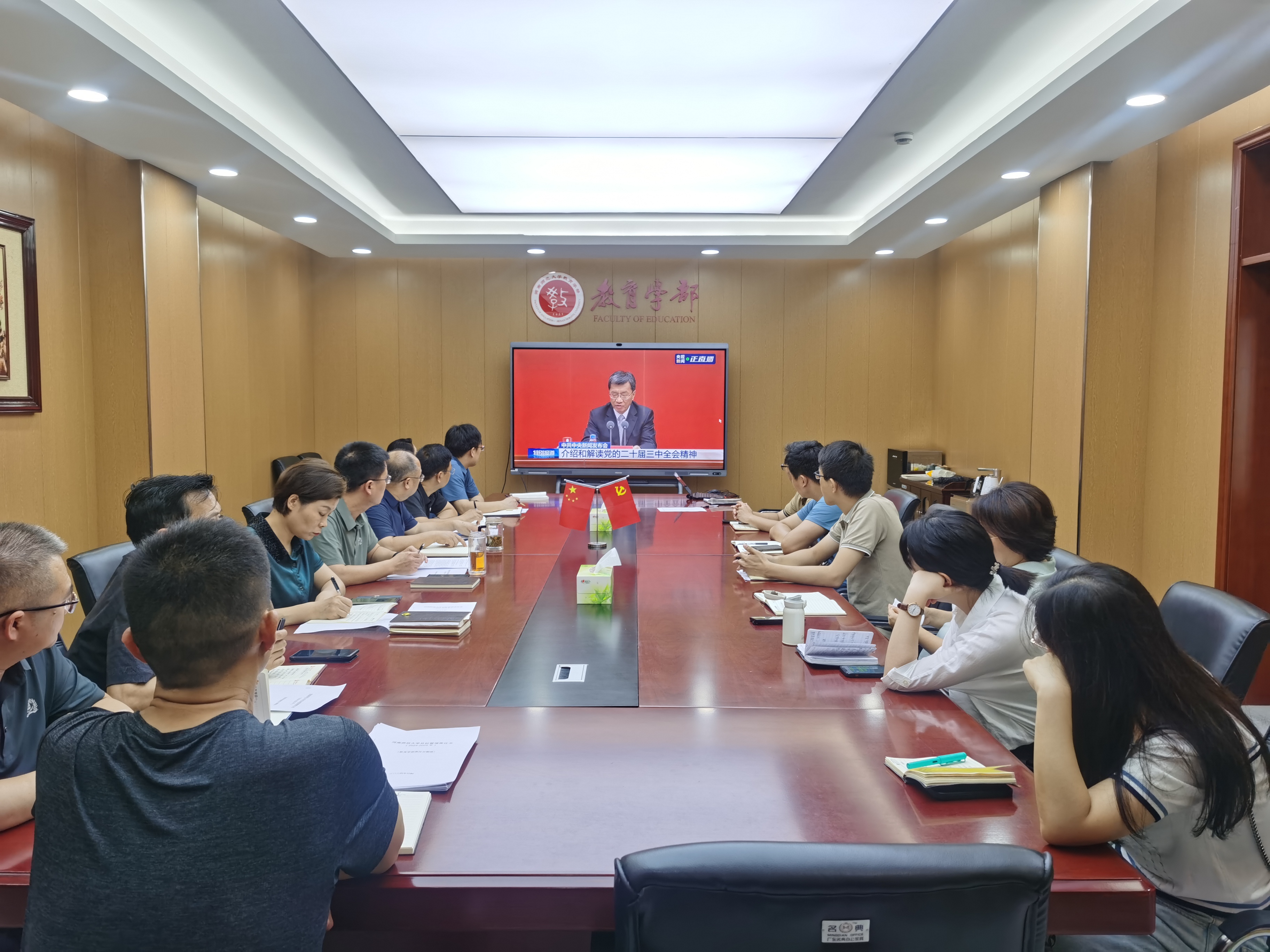 7月25日下午,教育学部在田家炳教育书院801会议室召开党委理论学习中心组(扩大)学习会议,专题学习党的二十届三中全会精神,学部党政领导班子、党委委员、教工党支部书记及专职辅导员参加学习,会议由学部党委书记陈勇主持。