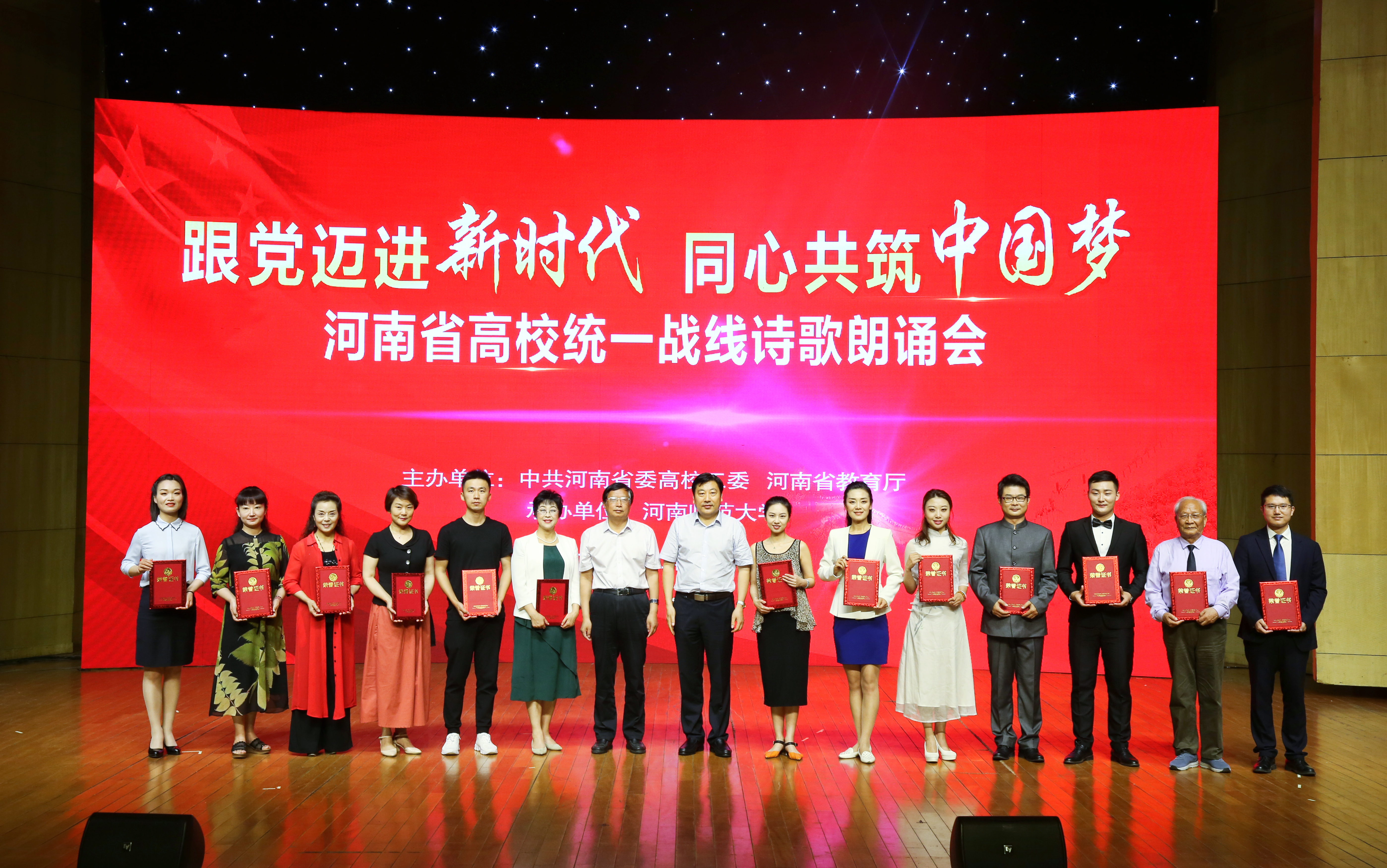跟党迈进新时代,同心共筑中国梦。为纪念中共中央发布“五一口号”70周年,6月2日,由中共河南省委高校工委、河南省教育厅主办,我校承办的河南省高校统一战线诗歌朗诵会决赛暨闭幕式在帕瓦罗蒂音乐厅举行。中共河南省委高校工委专职委员高治军,中共河南省委高校工委、教育厅统战处处长张水潮,中共河南省委高校工委、教育厅统战处副处长李志刚,我校党委副书记陈广文出席本次活动。省内41所入围诗歌朗诵会决赛的高校党委统战部部长、领队老师以及500余名学生代表共同观摩了此次朗诵会。