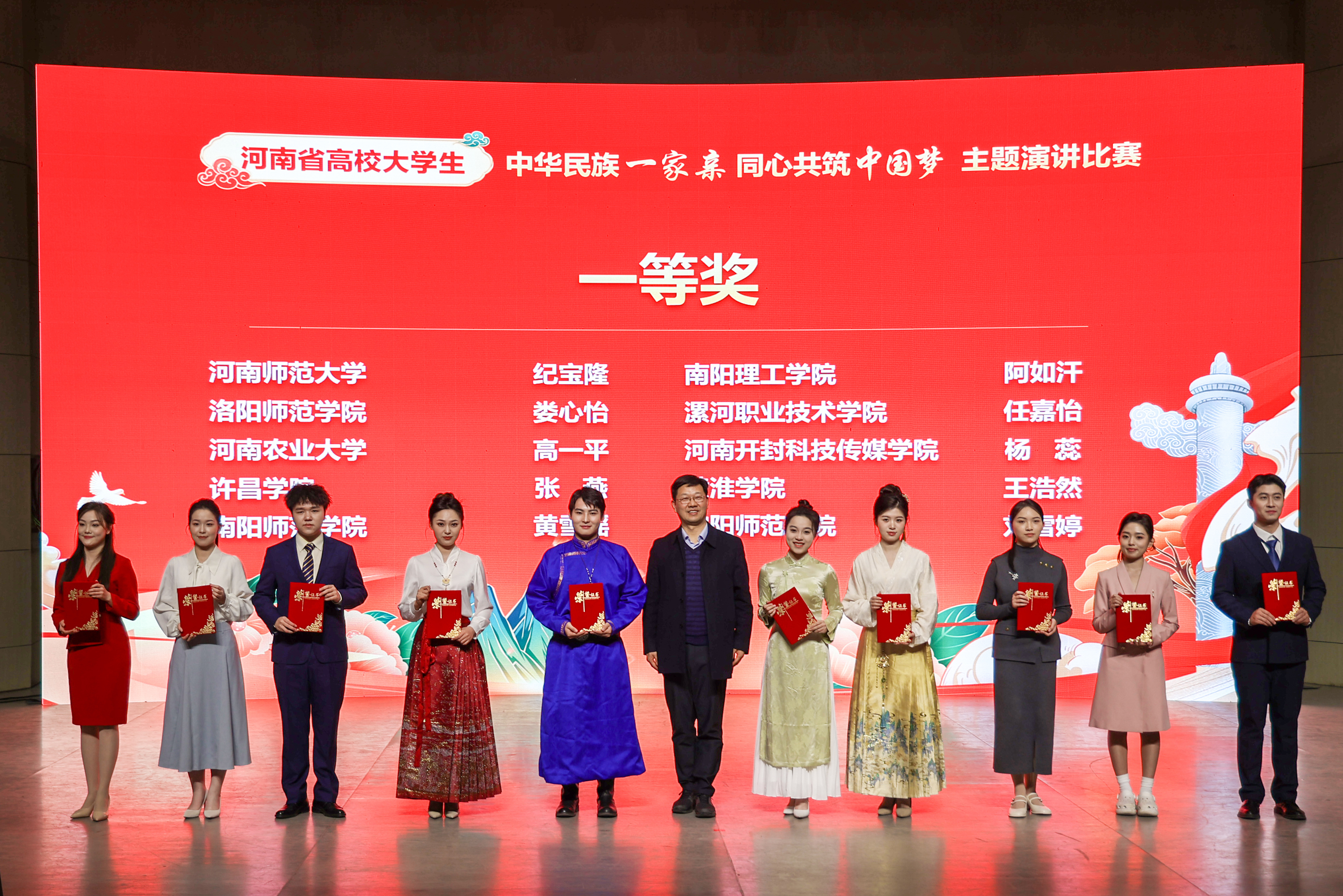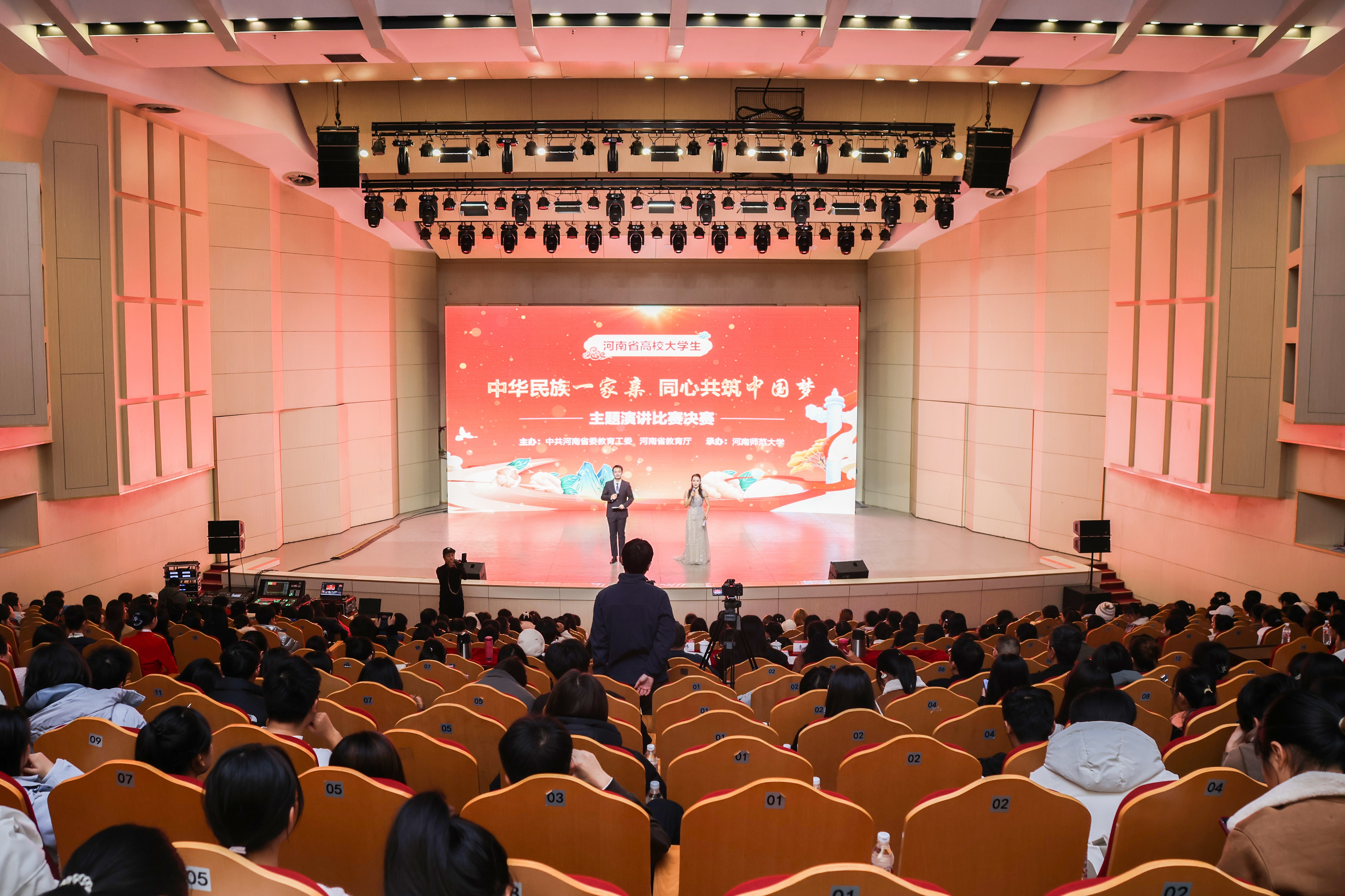 由中共河南省委教育工委、省教育厅主办,我校承办的全省高校大学生“中华民族一家亲,同心共筑中国梦”主题演讲比赛决赛在我校帕瓦罗蒂音乐厅举行。省委教育工委组织干部处处长、一级调研员王飞,省民族宗教事务委员会民族一处处长邵亚伟,省委教育工委组织干部处三级调研员高峰,校党委副书记张尚字莅临比赛现场。省内多位专家担任评委,全省45所入围高校相关领导,我校党委组织部、党委宣传部、党委统战部和马克思主义学院相关负责人,师生代表近500人共同观看比赛。
