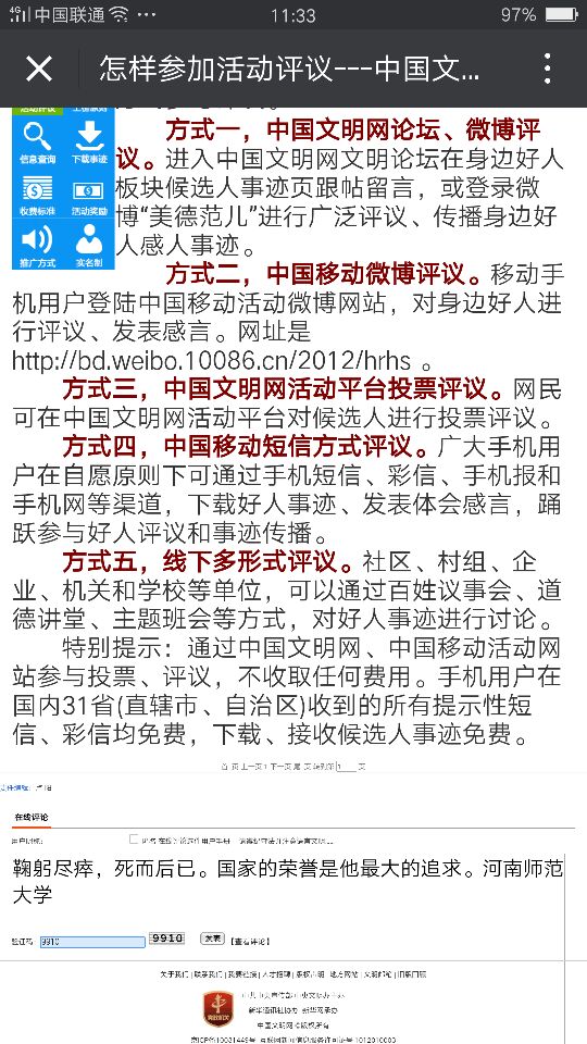 请各学院师生务必在评论时加上单位名称“河南师范大学”,以便新乡市文明办统计评论跟帖情况。评议时请将网页截图保存,示意图见附件4。