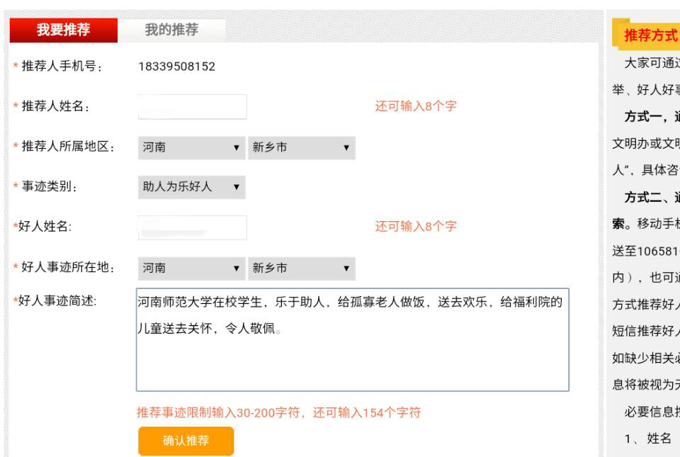 方式二:登录新乡文明网,点击飘窗“好人线索推荐”或页面中部好人线索推荐专栏, 打开链接后请填写移动手机号、图形验证码,点击获取验证码,填写验证码后登录,点我要推荐,填写相关内容。