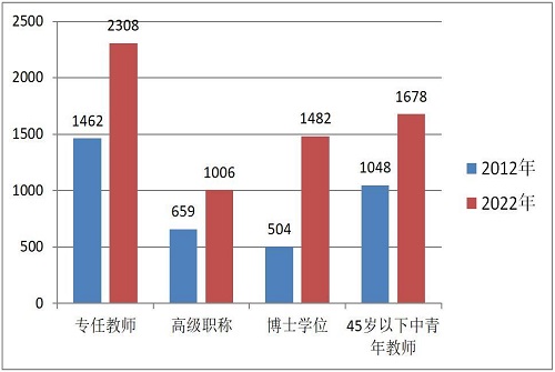 教师队伍不断壮大、师资结构持续优化。学校积极实施人才强校战略,专任教师职称结构、学历结构、年龄结构不断优化,已逐步形成一支以高层次、高学历人才和中青年教师为主体的师资队伍。十年来,累计引进教师1191人,其中博士1060人。专任教师由1462人增长至2308人,高级职称教师从659人增至1006人,其中正高级288人、副高级718人,高级职称占专任教师43.58%;具有博士学位人员从504人增至1482人,占专任教师的64.21%;45 岁以下的教师由1048人增长至1678人,占专任教师的72.7%。