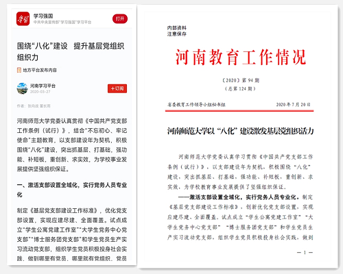 注重“出彩出色”,持续推动工作创新。创新基层党建工作思路和方式方法,实施“六个一”党建工程,把加强党的全面领导融入办学治校各环节,渗透到基层党组织的“神经末梢”,该工程被教育部网站专题刊登;探索实施基层党建工作“八化”建设,全面提升党建工作科学化规范化水平,该做法被河南省委主办的《党的生活》、学习强国刊发,并以河南教育工作情况简报形式报送中央教育工作领导小组秘书组秘书局、教育部办公厅;实施“项目带动工程”,打造了“高擎党旗、砺志增辉”工程、“增辉与关怀”工程、大学生公寓党员工作站、党员志愿服务等一批党建创新品牌;加强智慧党建融平台建设,推动“互联网+党建”融合发展。