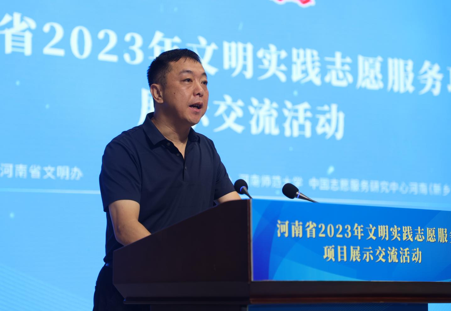 王勇代表新乡市委宣传部致辞,他介绍了新乡市近年来以新时代文明实践与志愿服务工作为抓手,加强公民思想道德建设、深化文明城市的经验做法。他表示,新乡市委宣传部将全力支持新时代文明实践阵地建设,联手河南师范大学共同开展专项课题研究、培养更多专业人才、孵化更多品牌项目,更好地推动新乡市文明实践志愿服务事业发展。