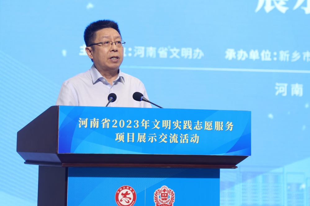 杨恒智代表河南省文明办致辞,感谢新乡市文明办与河南师范大学为本次展示交流活动精心筹备和周到服务。他指出,近年来我省文明实践志愿服务事业取得新进展,志愿服务带动力显著增强、志愿服务项目化成效明显、新时代文明实践建设稳步推进、志愿服务保障不断强化,有助于全面推进我省社会治理效能增强。他强调,各地新时代文明实践阵地负责人和志愿服务团队(组织)要切实推进志愿服务项目化,精准满足群众需求,丰富志愿服务菜单,加强培育扶持项目机制,强化相关政策保障。