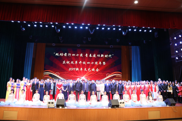 九州日升辞旧岁,四海潮起报春来。12月28日,“砥砺前行四十载,青春建功新时代”河南师范大学新联学院庆祝改革开放四十周年暨2019新年文艺晚会在多功能报告厅隆重举行。学院领导张永胜、金绪泽、李浩、张长伟、王虎出席晚会。全体教职工、家属和学生代表近500人一同观看了演出。