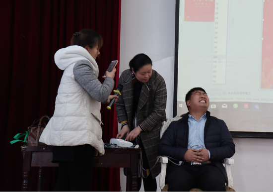 活动伊始,新乡市妇幼保健院妇幼保健科赵医生首先为到会女职工讲述女性分娩历程、具体的疼痛等级和分娩技巧等。接下来,在体验环节,学院10余名男教师依次上台参与分娩之痛体验。据赵医生介绍,疼痛体验采用的仪器是通过电极片将渐序输出的电磁波透射到皮肤深层,模拟阵痛的过程,让体验者感受到类似于拧、撕、拉、吸、捶等动作刺激,最高可达到分娩时的十级疼痛。参加体验的男教师们直呼:“说不上的痛,女性,真的不容易,以后要更疼爱妻子,更爱家庭。”此次活动不仅让男教师亲身体验女性分娩时的阵痛,体会女性分娩时的忍耐与艰辛,更进一步增强丈夫对妻子和家庭的责任感,提升女性的幸福感。