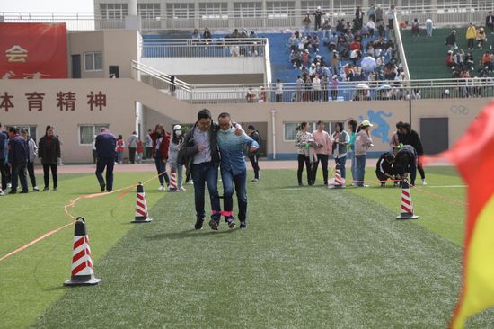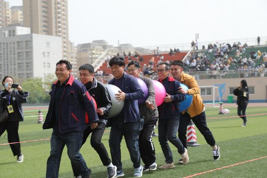 教职工运动会比赛项目分单人、双人和团体项目,分别是蒙眼罚篮、踢毽子、两人三足和快乐背夹球。在比赛项目设置上充分考虑了“以人为本、为了每一个教职工身心健康”的理念,设置了集趣味性和竞技性为一体的大家喜闻乐见的个人和集体比赛项目,即扣人心弦而又不失轻松活泼。在运动赛场上,老师们一改平日紧张、严肃的状态,个个生龙活虎积极参与,在绿茵场上绽放了别样精彩。参赛的每一个运动员、每一个团队都牵动着在场教职工的心弦,现场呐喊声阵阵,欢笑连连。