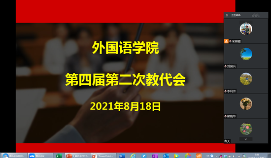8月18日上午,外国语学院以视频会议形式召开学院第四届二次教职工代表大会。会议由院工会主席曹崇主持,刘国兵院长与张军民副院长作了相关报告,外国语学院32名教代会代表全员参会。