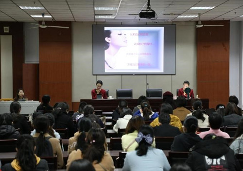 安娜讲师首先从化妆是一种历史悠久的容貌提升技术谈起,然后从皮肤的类型,清洁,护理等五个方面对面部妆前准备工作做了详细的介绍,不时赢得了在场女职工的阵阵掌声,极大地提升了老师们的兴趣。在讲座现场,两名彩妆模特当场做了面部护理与化妆演示,各步骤认真阐述说明,配合手法更让老师们切实感受到许多有用的化妆知识,完美展示了化妆带来的神奇效果。