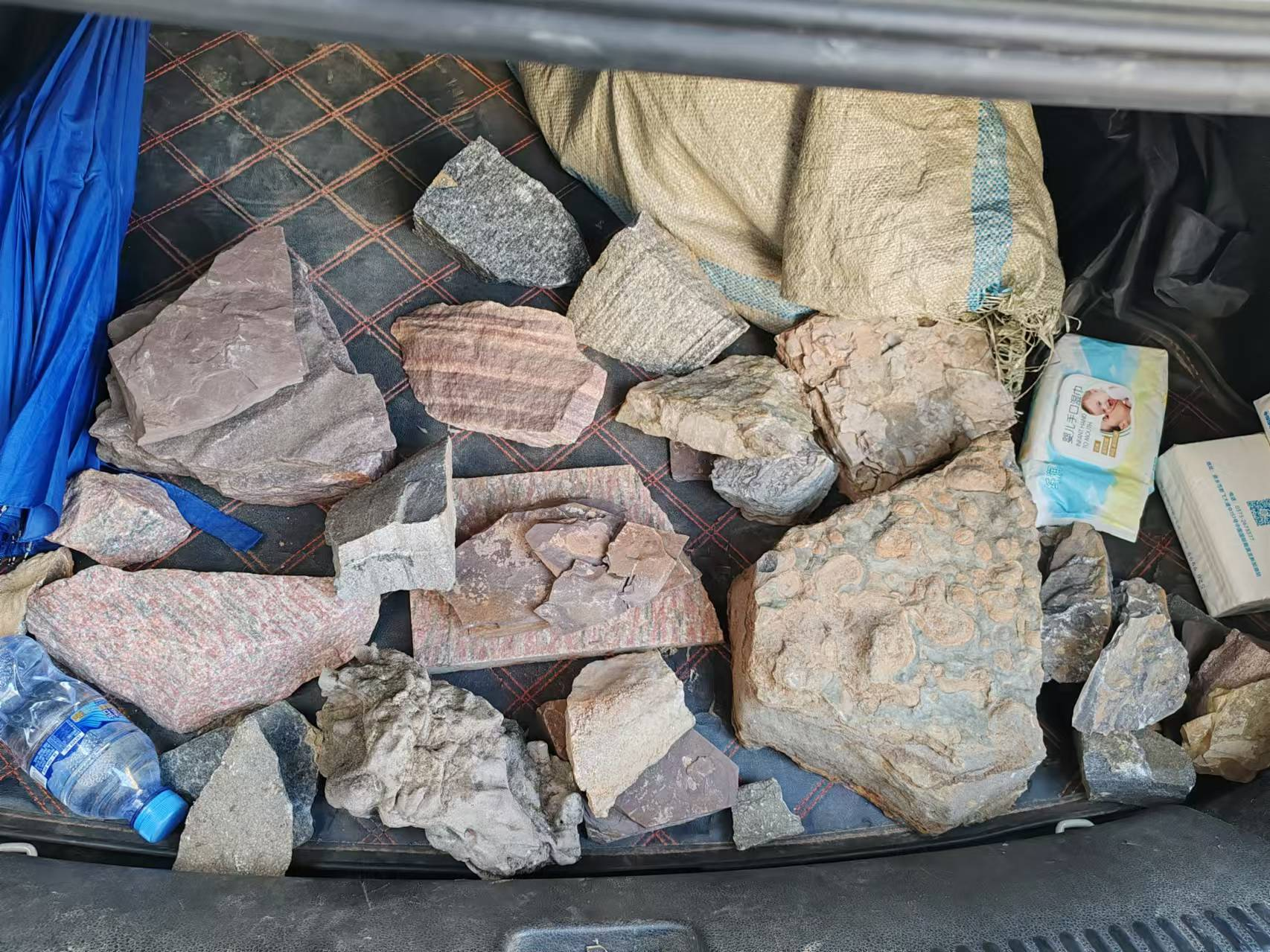 学院教师一行在关山国家地质公园负责人的介绍下,首先了解了关山的地质历史、地层结构及具有代表性的岩石种类。随后,老师们深入地质公园内部,观察关山的地层特征,鉴别岩石种类,寻找合适的采样地点。经过老师们齐心协力,此次共采集到了十多种典型的矿物岩石标本,包括页岩、白云岩、鲕状灰岩、竹叶状灰岩、结核状灰岩、平行层理石英砂岩、黑云角闪斜长片麻岩、波痕构造石英砂岩、不等粒状花岗岩、黑云钾长片麻岩、石钟乳、方解石等。