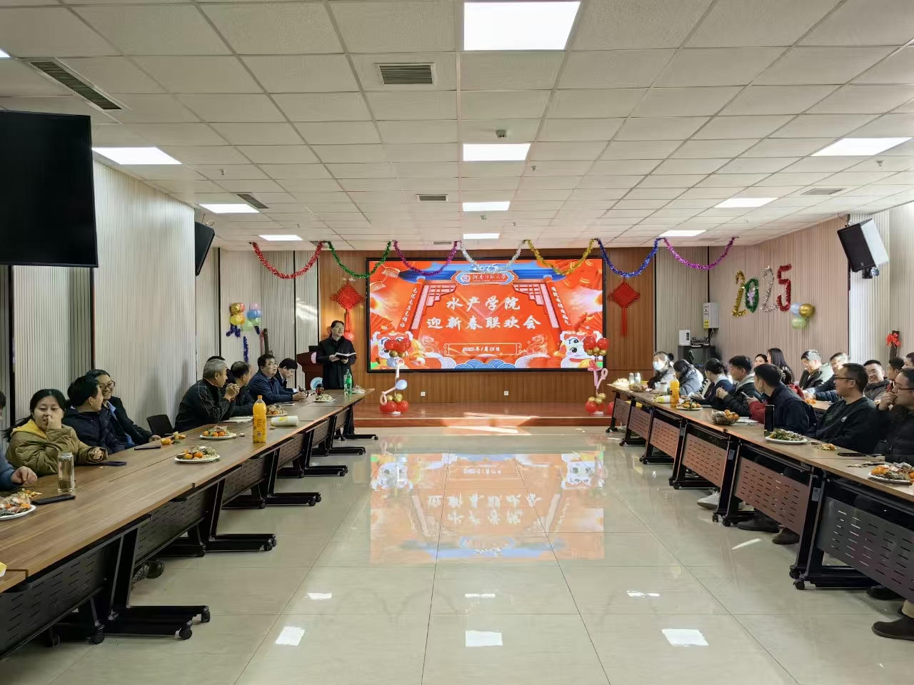 金龙含珠辞旧岁,银蛇吐宝贺新春。水产学院于1月15日在实训楼203会议室室举办了一场积极向上、温馨简洁、充满活力的2025新年联欢会。学院领导班子全体成员、教职工欢聚一堂,共迎新春,欢庆佳节。