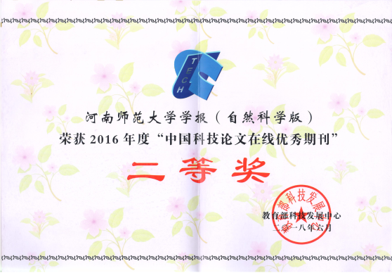 日前,教育部科技发展中心公布了教技发中心函〔2018〕38号表彰奖励文件并向我校颁发了获奖证书,《河南师范大学学报(自然科学版)》荣获“中国科技论文在线优秀期刊”二等奖。