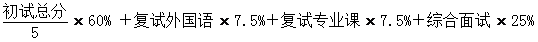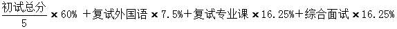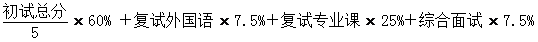 1.学术学位(除体育学、音乐与舞蹈学、美术学外)复试成绩占总成绩的30%,其中复试外国语7.5%,复试专业课7.5%,综合面试15%,总成绩计算公式为: