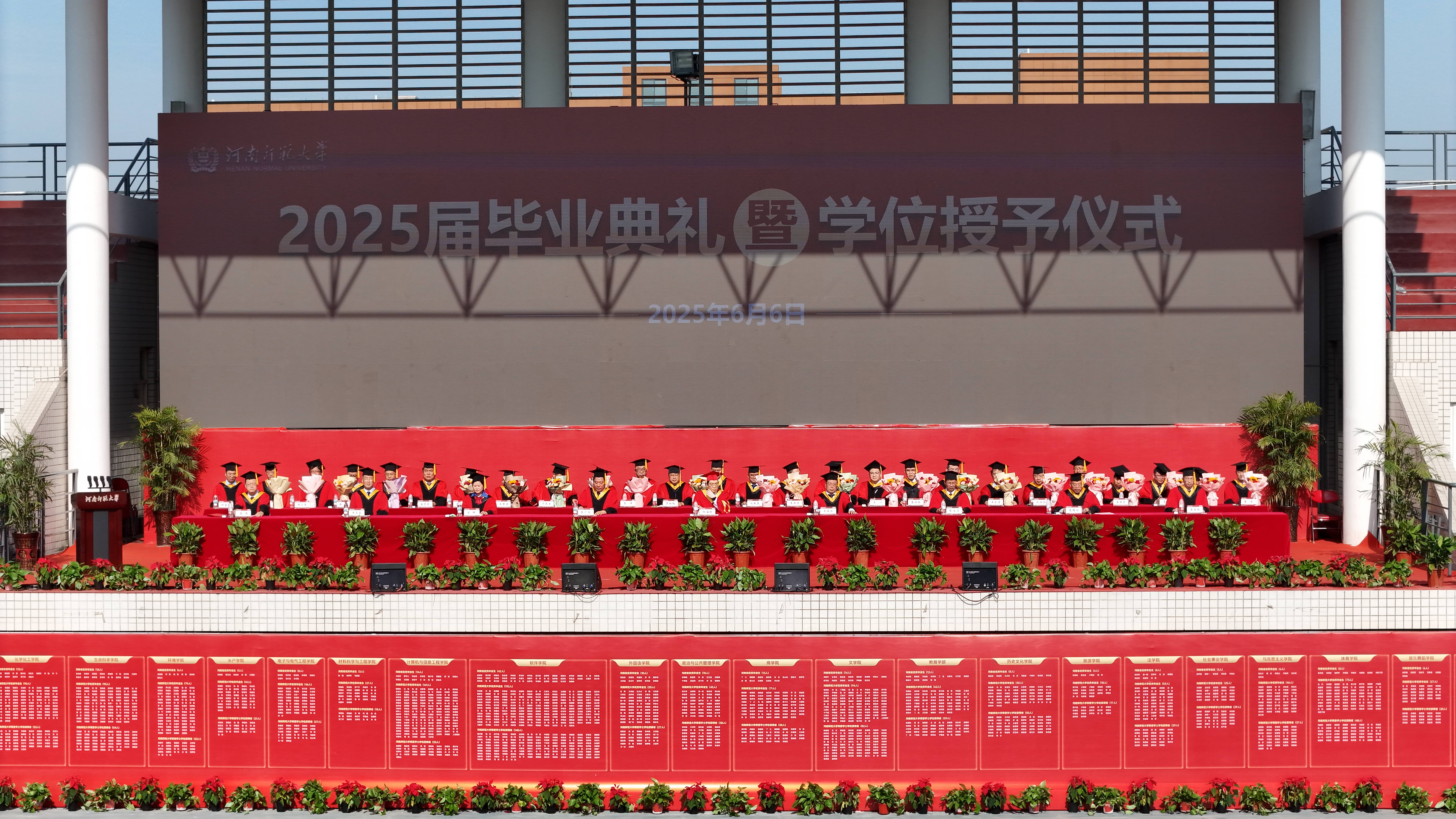 伴随着雄壮的国歌声,毕业典礼暨学位授予仪式正式拉开序幕。校党委常委、副校长苗雨教授宣读学位评定委员会学位授予决定,副校长宋晔教授宣读学位评定委员会荣誉学士学位授予决定。校党委副书记张尚字宣读《河南师范大学关于表彰2025届优秀毕业生的决定》和《河南师范大学关于推荐河南省2025年优秀应届毕业生的决定》。