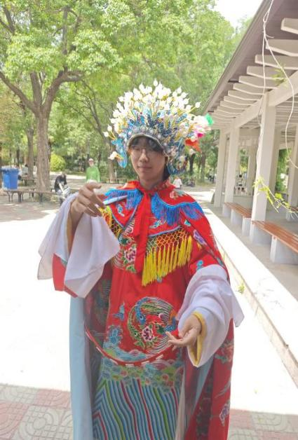 活动现场,活动讲解员从戏曲服饰的历史渊源讲起,以蟒袍、凤冠、帔、靠等经典戏服为样本,生动解读其色彩搭配、纹样寓意与穿戴规制。现场观众频频点头,惊叹于传统服饰中的文化密码,一旁的小朋友也被戏曲精美服饰深深吸引。在体验环节,社团负责人化身“文化导览员”,协助试穿制作精美的戏曲服饰并教授一些简单的戏曲身段,同学们从一招一式中体会戏曲服饰与表演艺术的紧密关联。