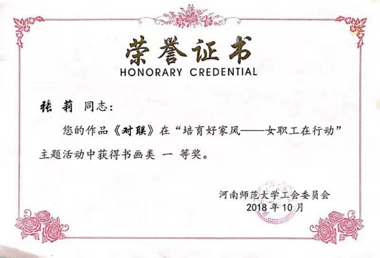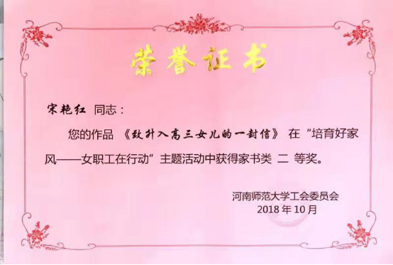 幼儿园张莉同志的作品《对联》在师大工会组织的“培育好家风——女职工在行动”主题活动中获得书画类一等奖,并代表学校参加省级评比,荣获二等奖。宋艳红同志的作品《致升入高三女儿的一封信》在“培育好家风——女职工在行动”主题活动中获得家书类二等奖。