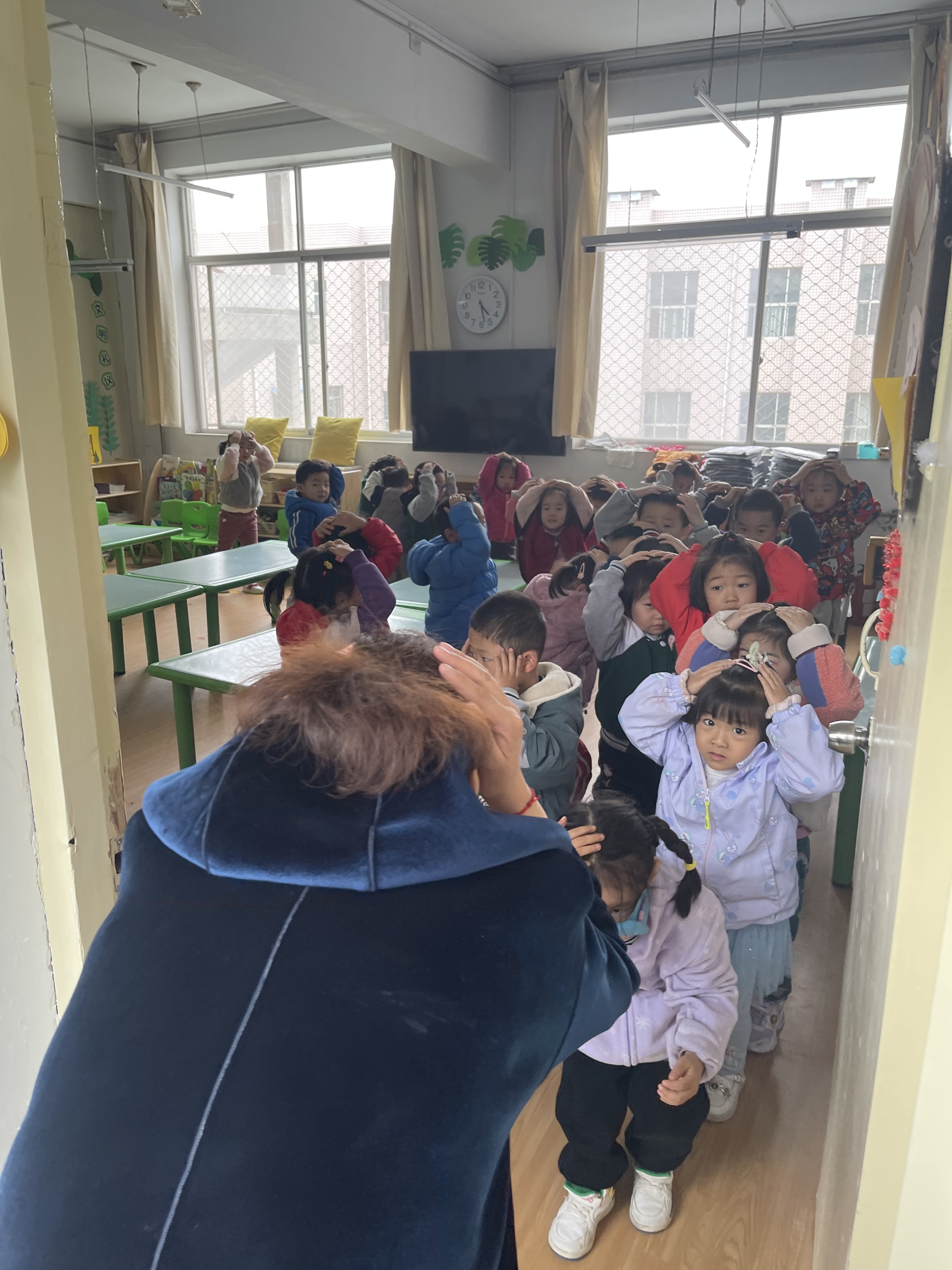 随着第一声警报声响起,各班教师立即组织幼儿就近避震,在桌子下、墙角下或是有硬物支撑的地方紧急避险,用双手护住头部,等待震感减弱后撤离。紧接着第二次警报声响起,教师迅速组织幼儿用手护住头部,弯腰低身,按照指定安全路线快速、有序的疏散,抵达安全区域后各班教师清点人数及时汇报情况。