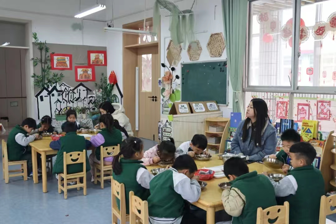 一顿营养而安全的餐点给幼儿一份欢喜、一份营养、一份健康成长。伴随着满园饭菜的香味,大家走进了大一班的教室,和小朋友热情地打招呼。