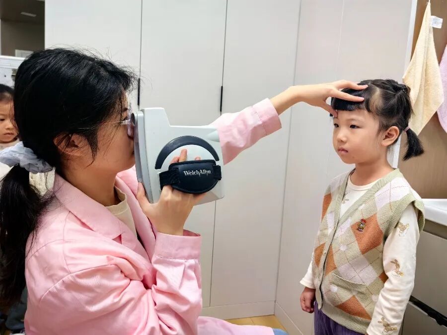 在口腔保健筛查区,医护人员耐心细致地为每位幼儿检查牙齿萌出情况、龋齿程度及牙龈健康状态,用温和的语言引导孩子配合检查,医护人员还向教师与保育员科普涂氟、窝沟封闭等龋齿预防知识,为幼儿园日常口腔保健工作提供专业指导。视力筛查区则严格依据《0~6岁儿童眼保健及视力检查服务规范》,采用儿童专用视力检测设备,精准检测幼儿视力发育水平、屈光状态及眼位情况。医护人员通过趣味图标、互动指令,吸引幼儿专注配合,确保筛查结果准确,并为每位幼儿建立专属视力健康档案,清晰标注年龄对应视力标准,便于后续健康追踪。