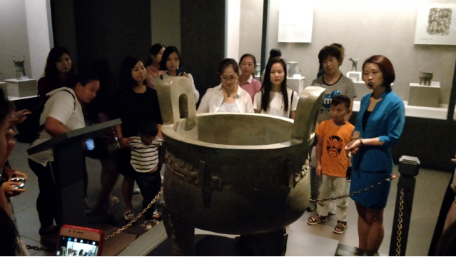 随着讲解员的讲解,开展了此次平原博物院学习之旅。在夏商周时期的展厅,讲解员带领我们一起参观学习了商周时期出土的一系列青铜器以及牧野古战场的复原图,其中重点介绍了镇馆之宝后司母戊鼎,青铜器上的饕餮纹、蟠螭纹,精湛的制作工艺,让我们看到了商周人民的勤劳智慧和独特的艺术审美。