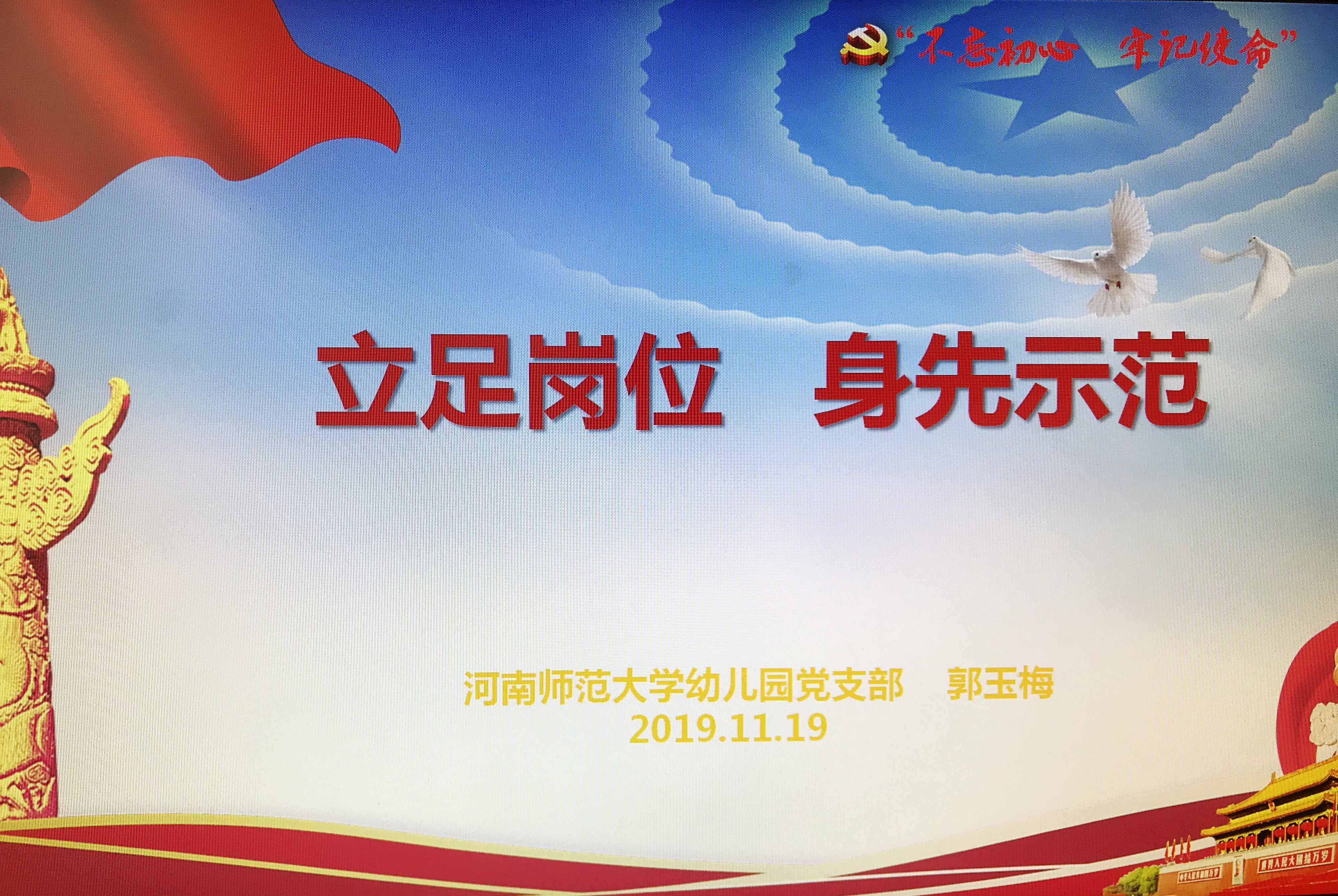 为深入贯彻落实习近平总书记调研河南时的重要讲话精神,推动“不忘初心、牢记使命”主题教育活动走深走实。11月19日上午,按照学校要求,幼儿园党支部全体党员在音体室集中开展了“初心使命四问”的主题党日活动。