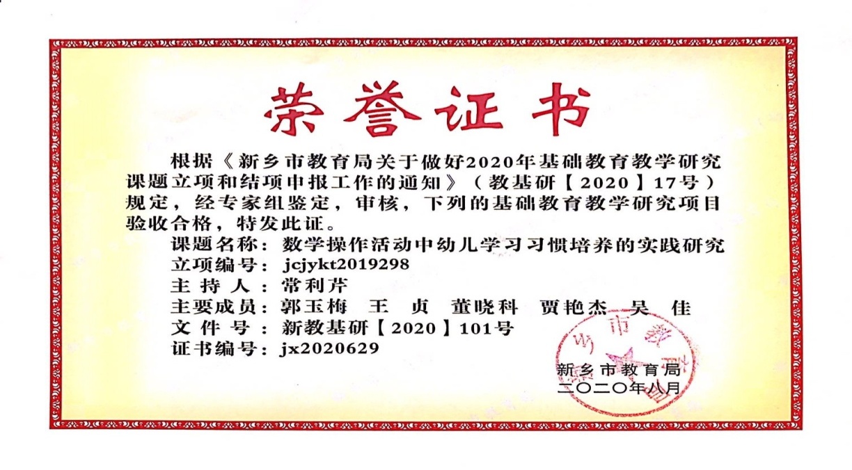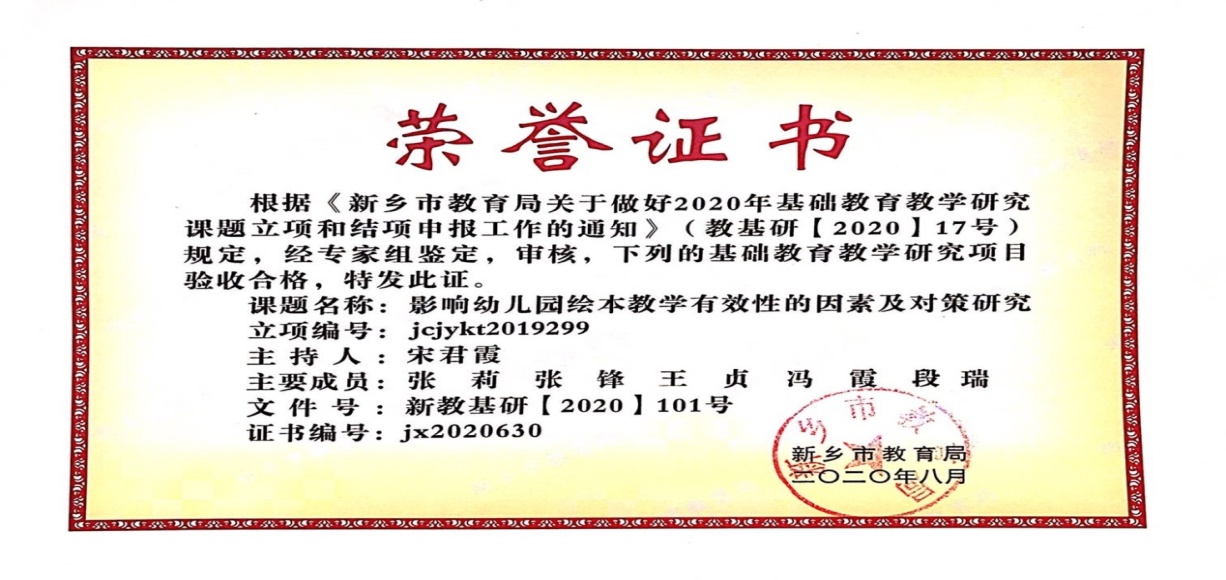 2020年8月,幼儿园两项新乡市基础教育教学研究课题《影响幼儿园绘本教学有效性的因素及对策研究》和《数学操作活动中幼儿学习习惯培养的实践研究》通过新乡市教育局验收合格,顺利结题。