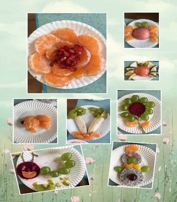 最后就是我们制作创意水果拼盘了,我们先请幼儿观察PPT,并大胆来说一说这些好看的造型都是用什么做的?然后想一想,这些水果还可以做出哪些好看的造型,尽量让幼儿发挥想象,创作出更多更丰富的水果拼盘。幼儿根据盘子里的水果开始制作水果拼盘。