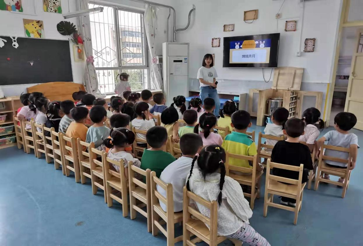 孩子们围坐在教室里,听老师讲月亮的传说故事《嫦娥奔月》、《月亮姑娘穿花衣》,朗诵关于月亮的古诗词,让幼儿了解中秋节的来历和相关传说。知道中秋吃月饼、赏月等习俗,从而进一步懂得圆圆的月饼寄托着团团圆圆的美好祝福。