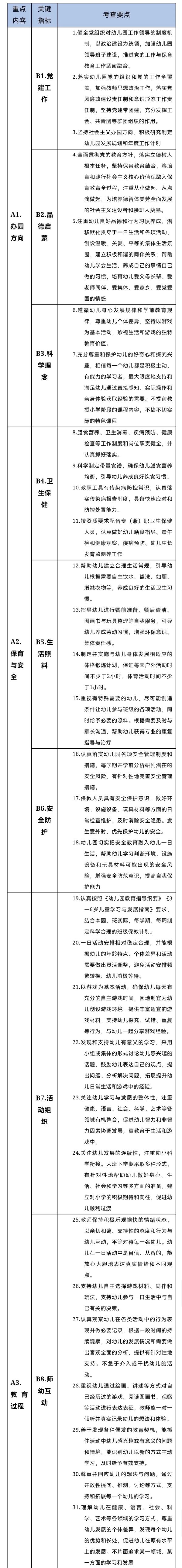 (一)办园方向。包括党建工作、品德启蒙和科学理念等3项关键指标,旨在促进幼儿园全面贯彻党的教育方针,落实立德树人根本任务,强化党组织战斗堡垒作用,树立科学保育教育理念,确保正确办园方向。