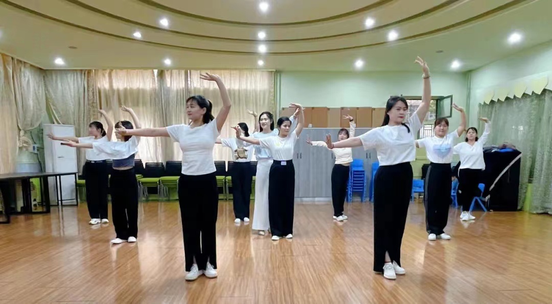 成立仪式上,曹莎向青年教师们讲解了舞蹈的起源、各种舞种的发展以及古典舞基本手位,并针对动作进行剖析和指导。大家随着音乐翩翩起舞,脸上洋溢着灿烂的笑容,一首首经典舞曲环绕着整个音体室。