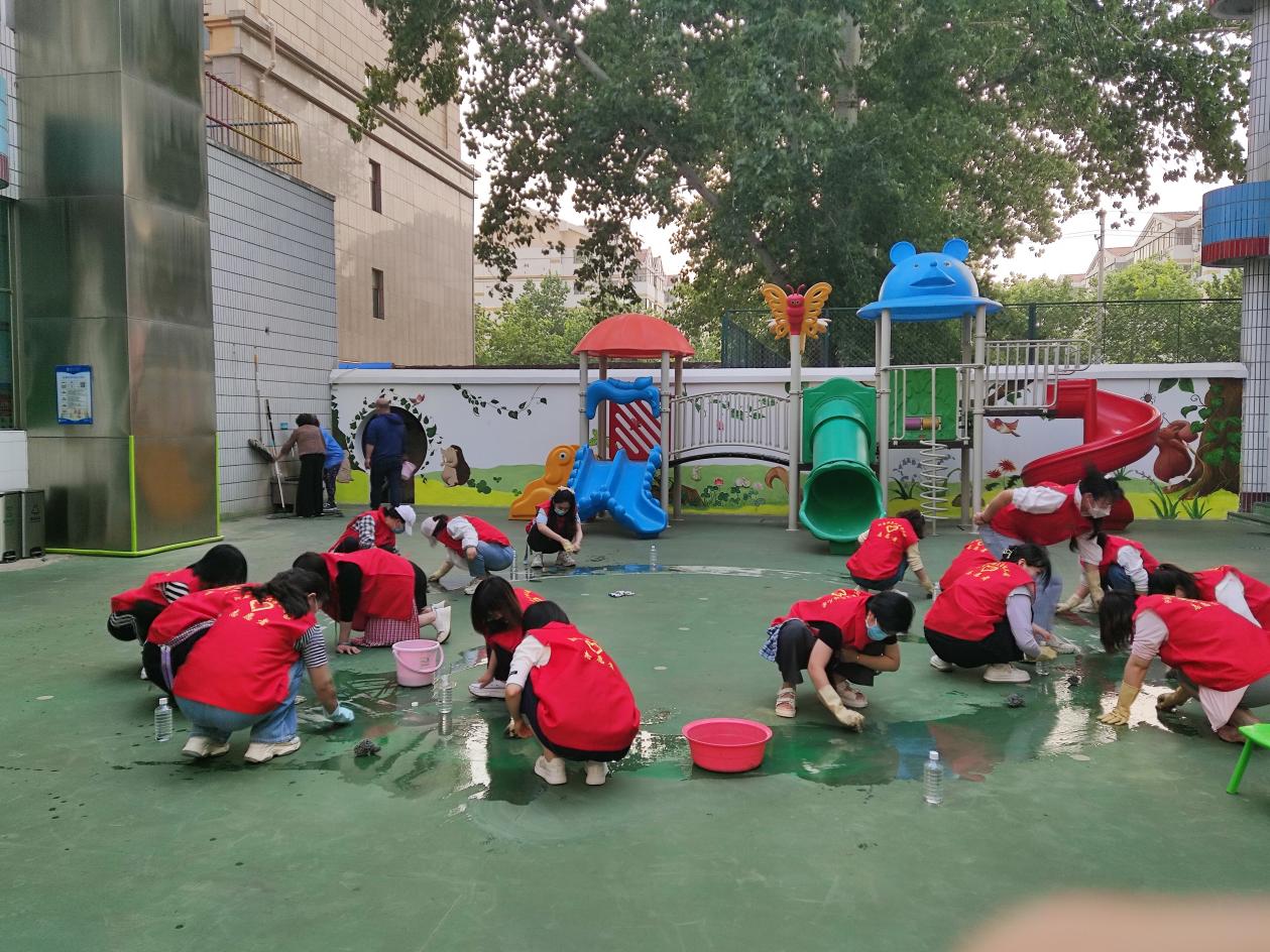 学习结束后,在常利芹的带领下,全体党员、团员教师志愿者们带着抹布、水桶、钢砂球等劳动工具,将幼儿园户外活动场地,多年沉积、模糊不清的地胶线进行深度清理,冲洗地面、卫生死角等。