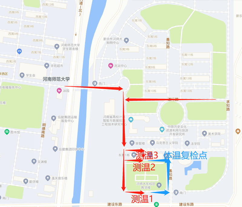 根据疫情防控需要,考生经由拓行路(东苑餐厅东)进入考区(红色箭头标记路线),并接受体温检测。