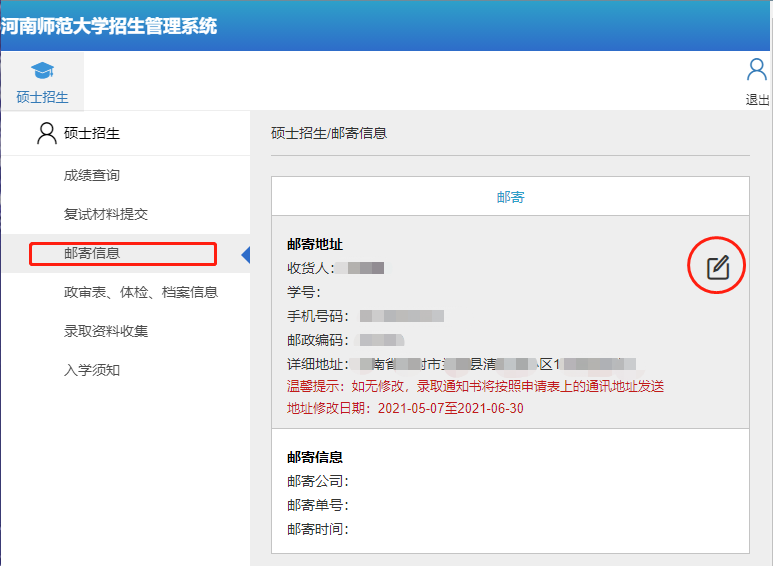 2、考生选择“邮寄信息”模块核对确认邮寄信息,若需修改请点击右上角修改图标进行信息修改。修改完成后点击“保存修改”。填写详细地址字段时请务必将“省-市-县-区-街道-门牌号”等信息填写完整。