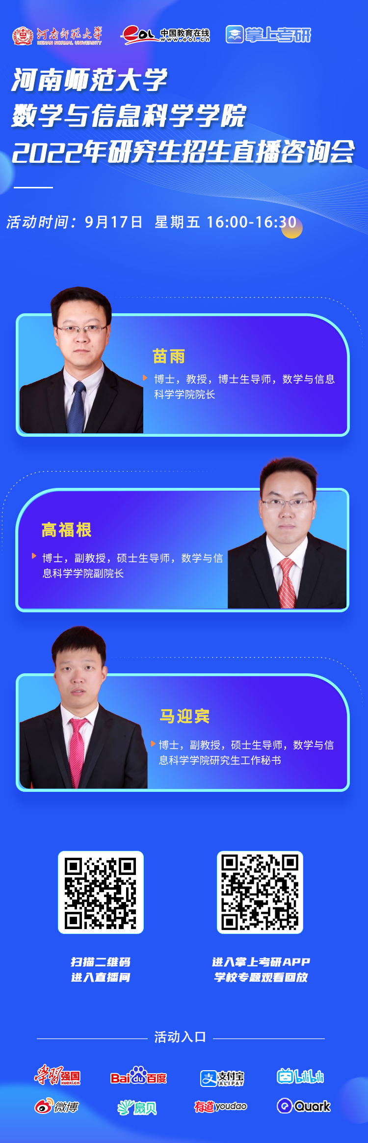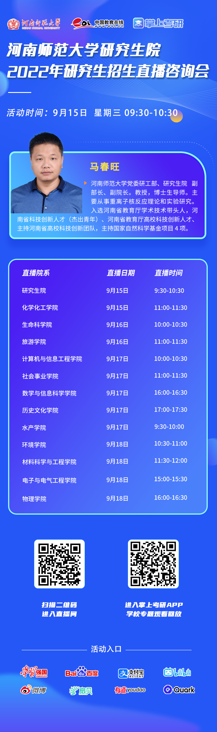 为满足考生对研招政策咨询需求,建立招生单位与考生之间高效的信息沟通渠道,中国教育在线·掌上考研联合河南师范大学举办的2022年研究生招生直播咨询会即将开启!活动期间,我校研究生院将携手12个学院主讲老师进入直播间,为考生全面介绍学校(院)概况、专业特色、培养方案、奖助学金体系、就业前景等,解读最新招生政策,帮助考生了解更多招生信息。在这里你可以直接与学校(院)对话,了解招生详情,现场答疑解惑。