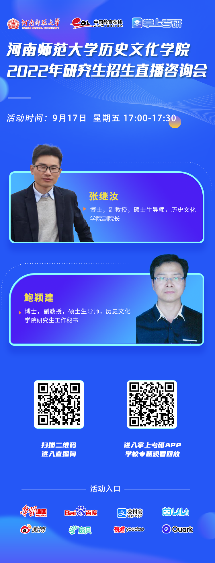 本次招生宣讲活动会在中国教育在线考研频道、掌上考研app、学习强国、网易有道、扇贝等同步上线,在支付宝校园频道、微博、B站等均可以观看直播回放,敬请关注!