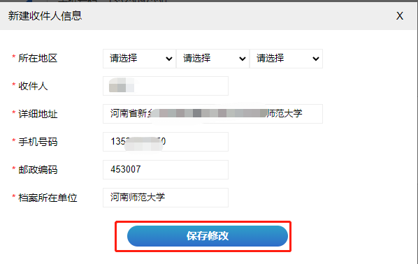 考生选择“邮寄信息”模块核对确认邮寄信息,若需修改请点击右上角修改图标进行信息修改。修改完成后点击“保存修改”。填写详细地址字段时请务必将“省-市-县-区-街道-门牌号”等信息填写完整。