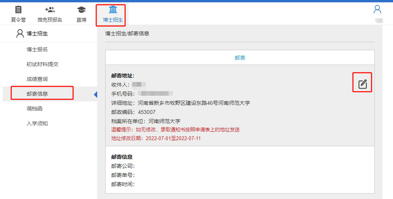 特别提醒为保证后续工作的顺利进行,我校开通了研究生管理系统的档案管理部门和通知书邮寄地址变更的功能模块。请需要修改档案管理部门、通知书邮寄地址及联系电话的考生在7月1日前完成修改提交工作。逾期未确认的,将按照网上报名时填写的相关内容进行调档函的制作和通知书邮寄工作。(学校系统暂不支持直博生相关信息的修改,请直博生填写下方收集表,我们将统一进行收集更新,