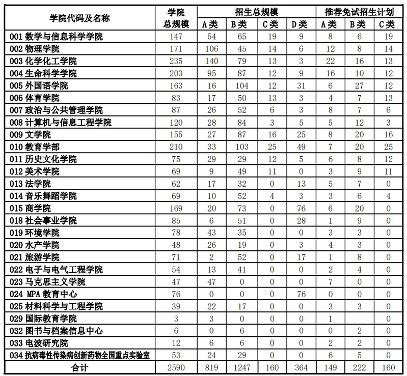 为了分类管理招生计划,我校将研究生招生分为四类,即全日制学术学位(A类)、全日制专业学位(B类)【不包含农村师资教育硕士计划(以下简称硕师计划)】、硕师计划(C类)、非全日制专业学位(D类)。各单位拟招生计划见表1,总规模中包括推荐免试招生计划,推免录取结束后(预计在2023年10月底前)在研究生院网站公布实际录取名额。推荐免试中A类、B类为预计招生数,C类按所列计划招生。