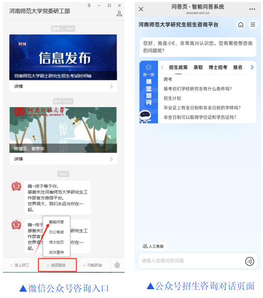 关注后可进入到“河南师范大学党委研工部”微信公众号主页,点击底栏“信息服务”菜单栏的“智能问答”即可在线咨询。公众号招生咨询平台问答页同时支持语音提问。