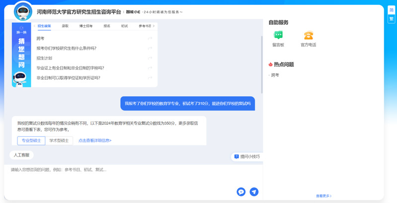 当你问“我报考了你们学校的教育学专业,初试考了310分,能进你们学校的复试吗”时,系统不仅能通过DeepSeek大模型技术精准识别你的咨询意图是:专业、复试录取分数,还会结合历年录取数据,为你提供更有参考性的回复!